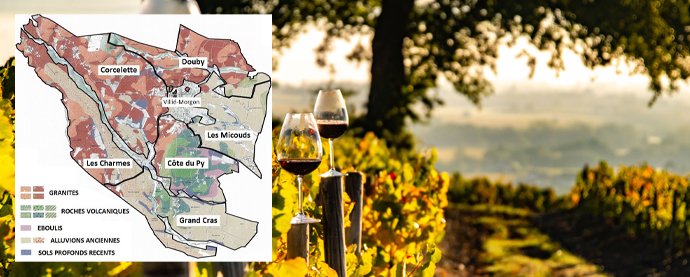 L'aire géographique d'appellation du cru MORGON est divisée en six micro-terroirs appelés « climats ». Ces climats forment six entités homogènes tant au point de vue du terrain que de l'exposition. Nous allons vous les détailler